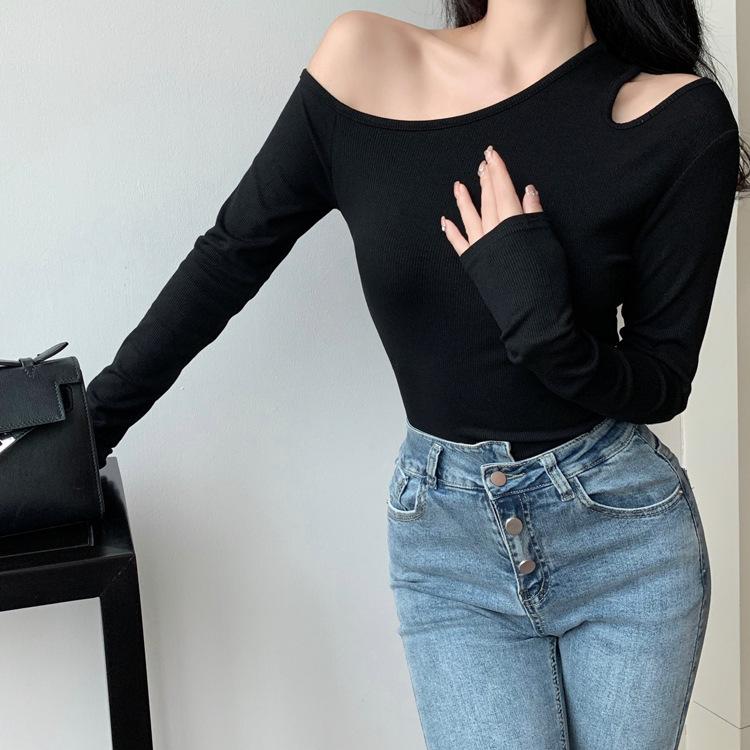 A sleek, off-shoulder long-sleeve crop top with a modern skew collar and subtle cut-out detailing — flattering, fitted, and effortlessly stylish.